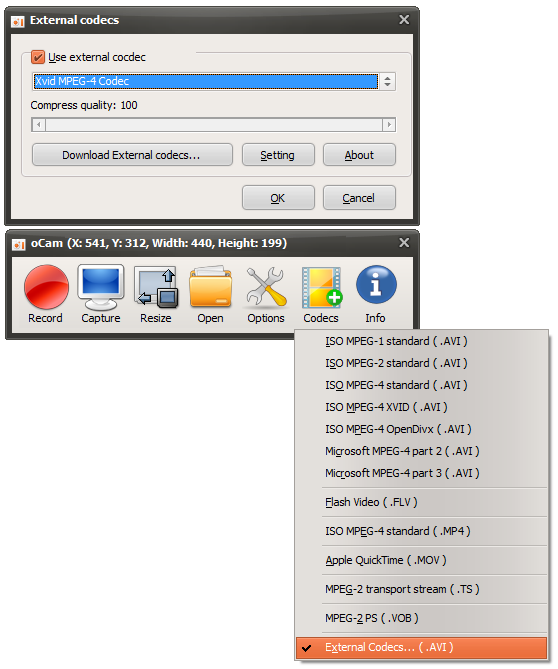 If oCam is already running, restart oCam, then click the Codec button on oCamโs main window and click the External Codec menu.