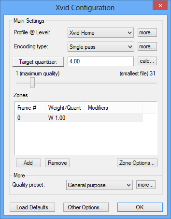If you click the Settings button, you can set detailed options for the Xvid codec.