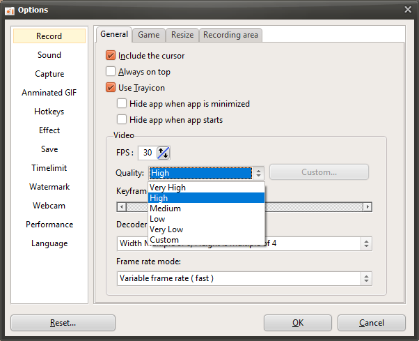 Note: This setting does not apply to external codecs and only applies to oCam's built-in codecs. Lowering the recording quality will reduce the size of the recorded video file, but the video quality will also decrease.