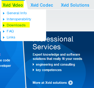 Click Xvid Video - Downloas in the menu at the top right. ( Do not select Xvid Codec. )
