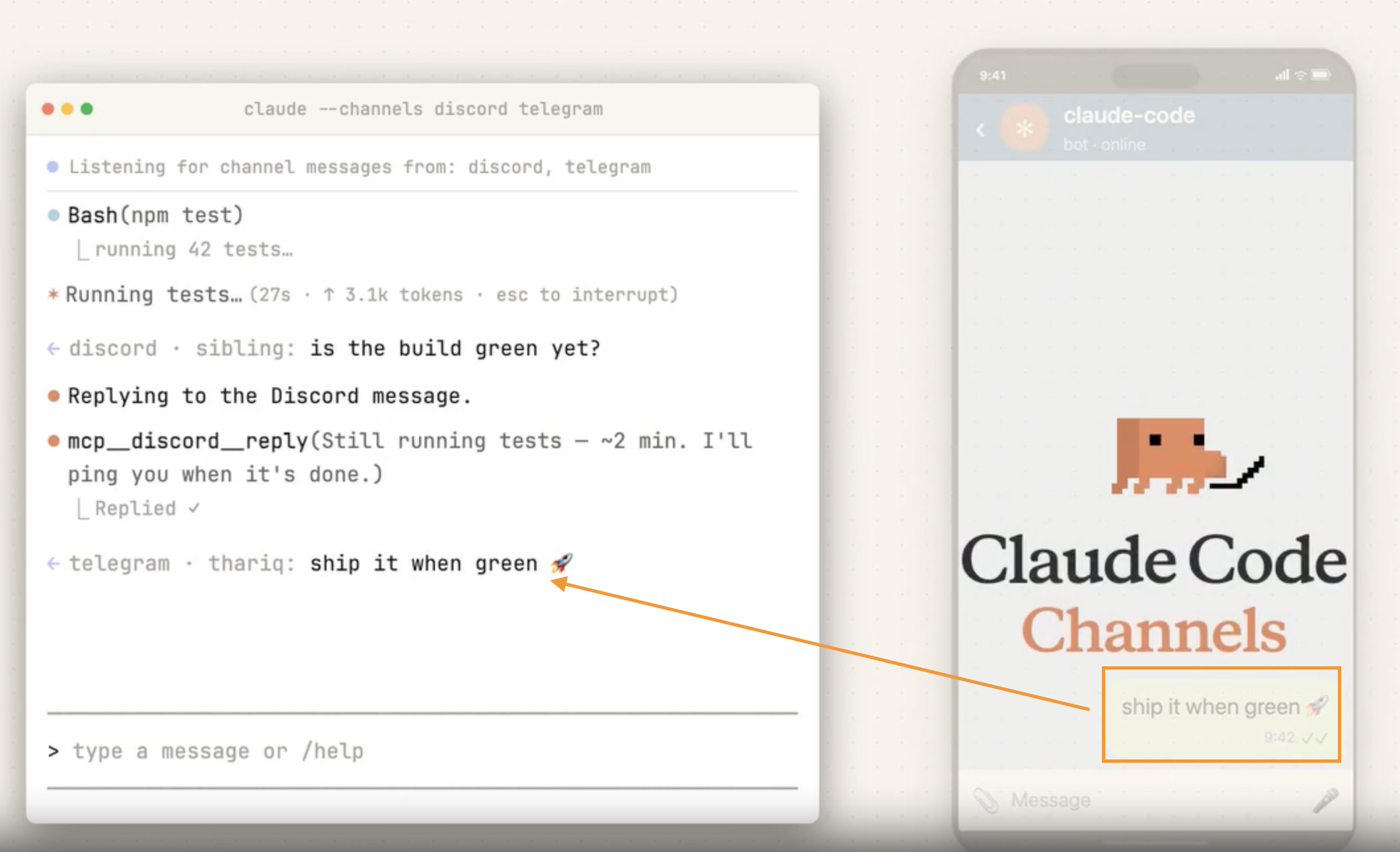 현재 Channels는 텔레그램과 디스코드를 우선 지원합니다. 덕분에 사용자는 꼭 데스크톱 개발 환경 앞에 앉아 있지 않아도, 이동 중이거나 외부에 있는 상황에서도 기존에 진행하던 Claude Code 세션에 바로 연결해 명령을 내릴 수 있습니다. 예를 들어 “방금 오류 난 부분 다시 확인해줘”, “테스트 결과 요약해줘”, “그 코드 리팩터링 계속 진행해줘” 같은 요청을 모바일에서 간단히 전달하는 식입니다.