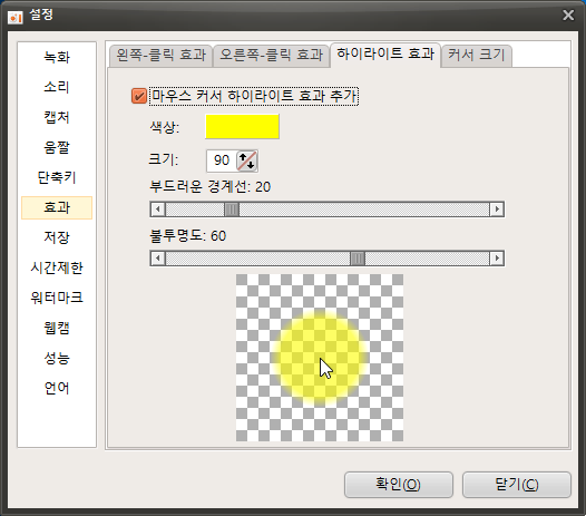 하이라이트 효과는 동영상을 보는사용자에게 현재 마우스 커서의 위치를 바로 알 수 있도록 하기 위해서 사용합니다.