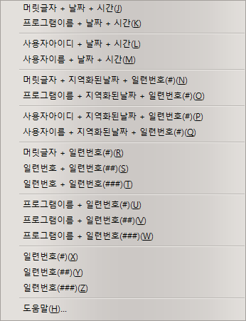 - 파일 이름이 <dddddd>_<#> 이라면 dddddd는 지역화 된 날짜를 의미하는데 한국어 운영체제를 사용할 때 이 글을 작성하고 있는 현재 날짜인 2016년 6월 16일 목요일로 대체되게 되며 #은 일련번호가 들어갑니다.