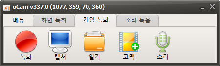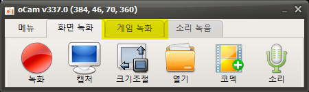 클릭하면 다음과 같이 게임녹화 탭으로 변경되고, 크기 조절 버튼이 사라지게 됩니다.