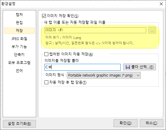 예를 들어 캡처를 3번 했을 때 "이미지 <##>" 라는 파일이름이 지정되어 있다면