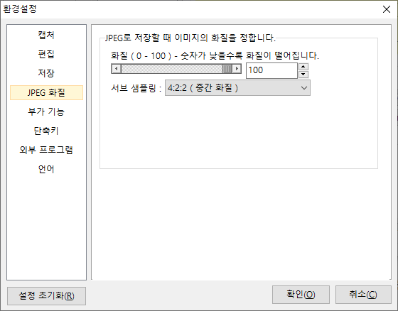 캡처, 저장, JPEG품질, 부가 기능, 단축키, 언어로 나뉘는데, 각 옵션별로 어떤 기능들이 있는지 소개하도록 하겠습니다.