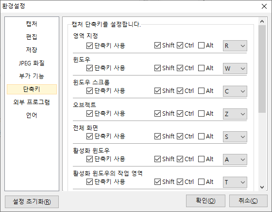 단축키 부분은 캡처 방식 마다 자신이 편하게 쓸 수 있는 단축키를 지정하실 수 있습니다.