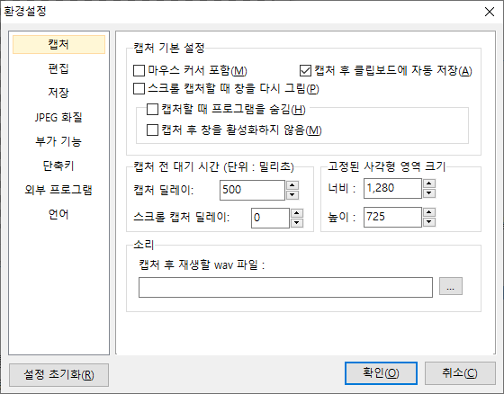 환경설정을 통해서 캡처에 대한 옵션이나 이미지 저장 설정조절 및 단축키 지정이 가능합니다.